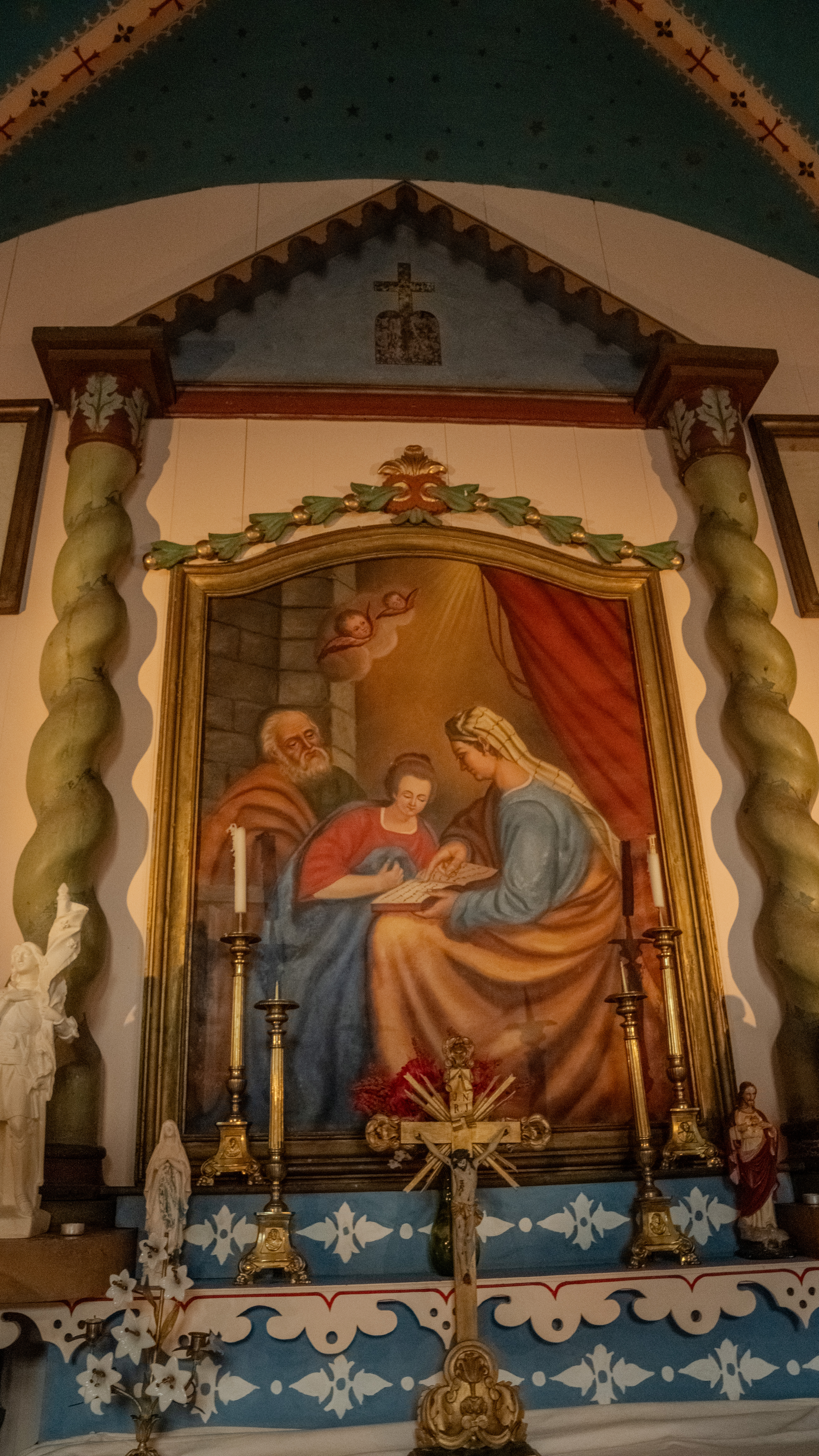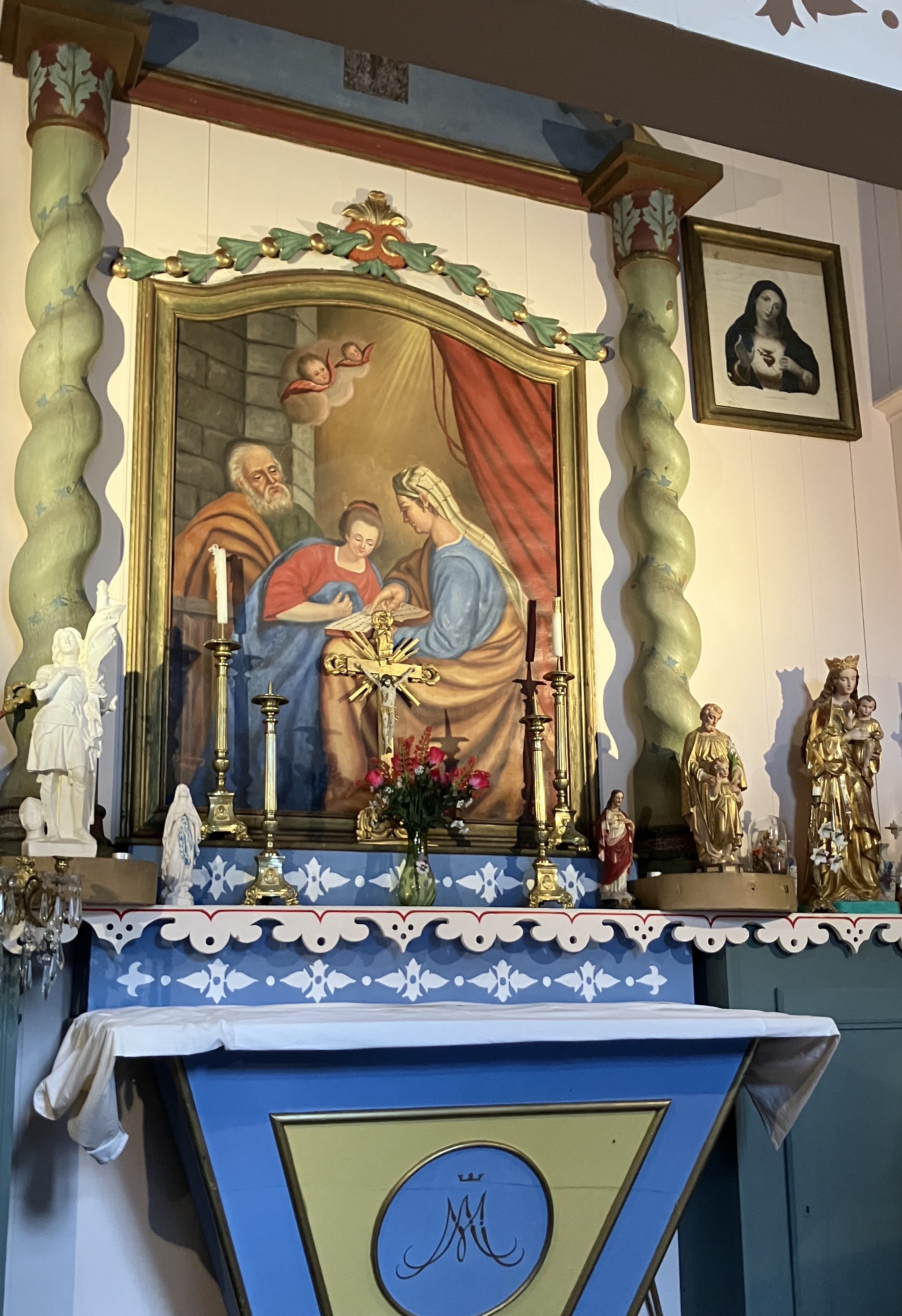 Le tableau central, datant de 1860, peint par l’artiste Griotteray représente Ste Anne enseignant à Marie la lecture. Les statues de St Claude, St Martin, St Joseph et St Antoine de Padoue sont en plâtre, évolution technique caractérisant la fin du 19 eme s.