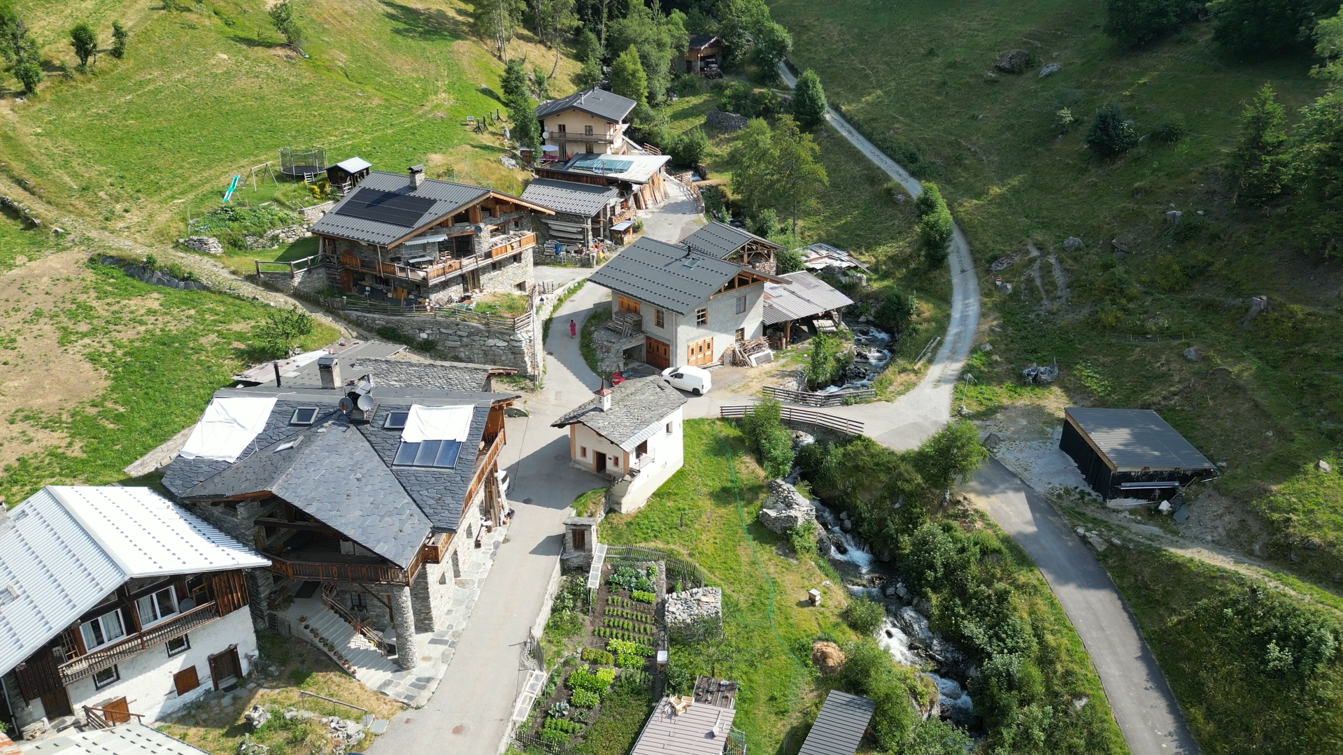 Le torrent des Moulins qui coule ici déverse en aval dans l’Isère les eaux de fonte, de sources ou d’écoulement d’un bassin versant important dominé par Le Roc Noir, le Lac du Retour et le Mont Valaizan . De nombreux moulins pour scier les planches, faire de l’huile, fouler la toile de drap ou moudre le grain ont disparu au début du 20 ème s. suite à des crues importantes. Jusque vers 1960, Le four de Maitre Pierre a cuit le pain bis, pour toute la communauté, une à deux fois par an. (A chaque famille de fournir le grain, le bois, les journées d’aide, pour obtenir un pain qui va se conserver plus d’un an au grenier). Puis l’eau captée par EDF en amont au Pisch et à Putétruit va participer au remplissage du barrage de Roseland (terminé en 1961). Elle fera fonctionner les turbines de La Bathie pour alimenter en énergie la France.