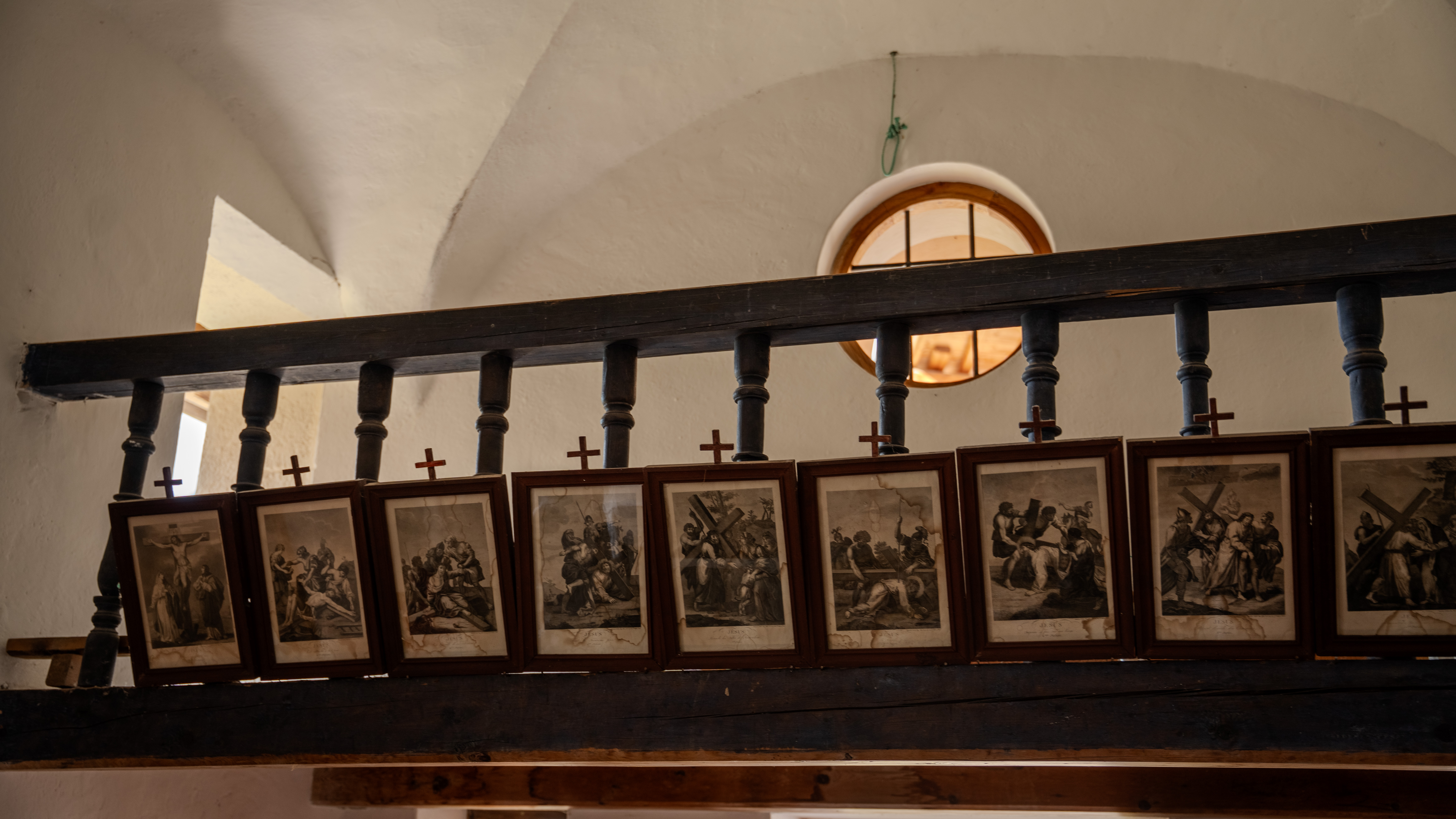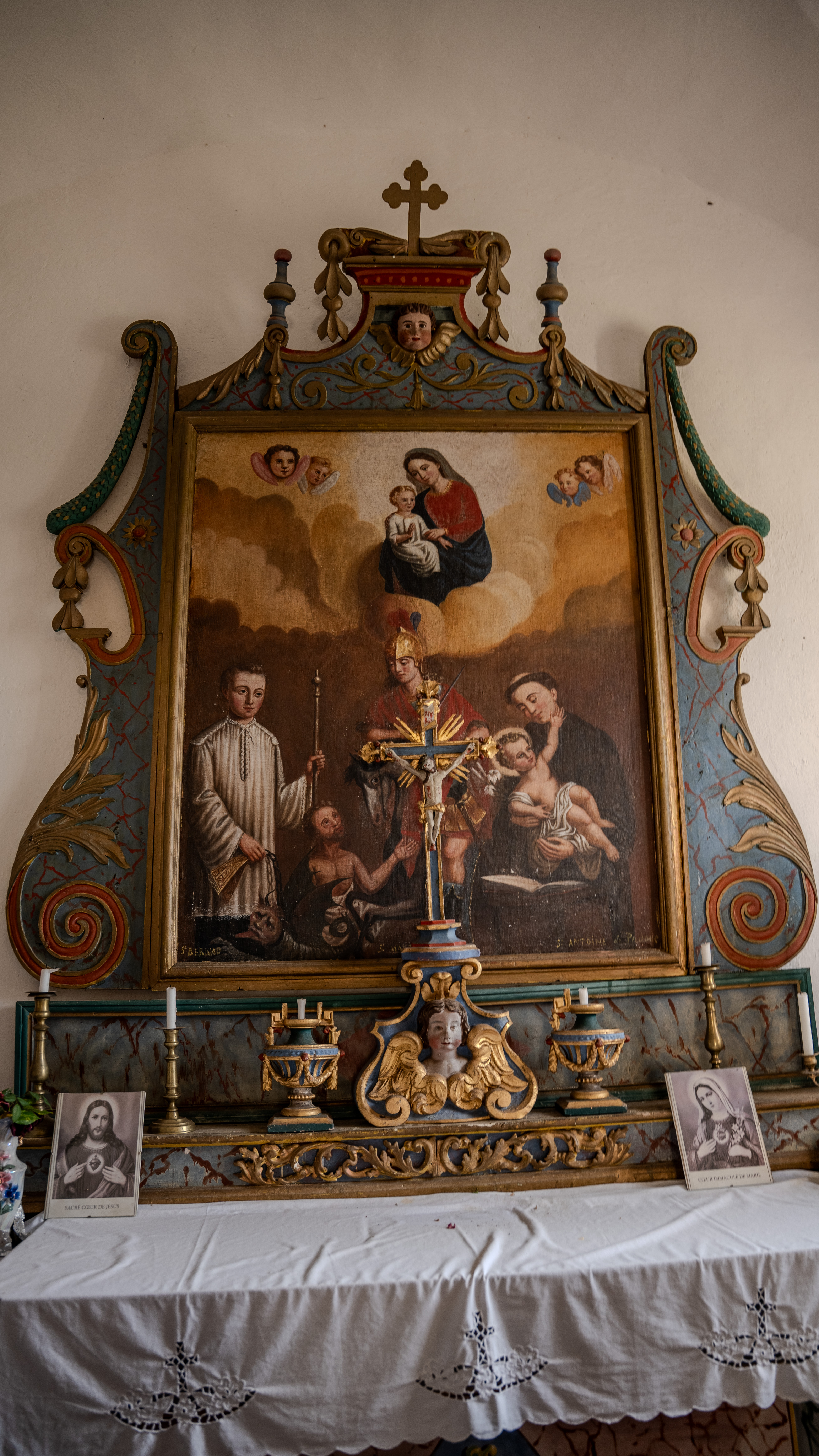 L’intérieur : Le choeur, espace relativement réduit, coiffé d’ une voute d’ arête, intègre l’ autel surmonté d’une toile centrale avec un encadrement en bois travaillé. Les enduits sont blancs en partie haute, en partie basse ocre rouge dans la nef et violine marbré dans le choeur. La table de communion, en bois plein, peinte en faux marbre bleu ciel sépare les espaces. De part et d’ autre de la toile centrale sont peints des cartouches avec motif floraux. Sur la toile sont représentés en partie haute dans les nuées au centre La Vierge et l’Enfant jeune, sur les cotés des angelots. En partie basse se trouvent St Bernard et St Antoine de Paddoue et au centre sur un cheval St Martin, guerrier, portant casque, épée et manteau rouge, un mendiant à ses pieds.