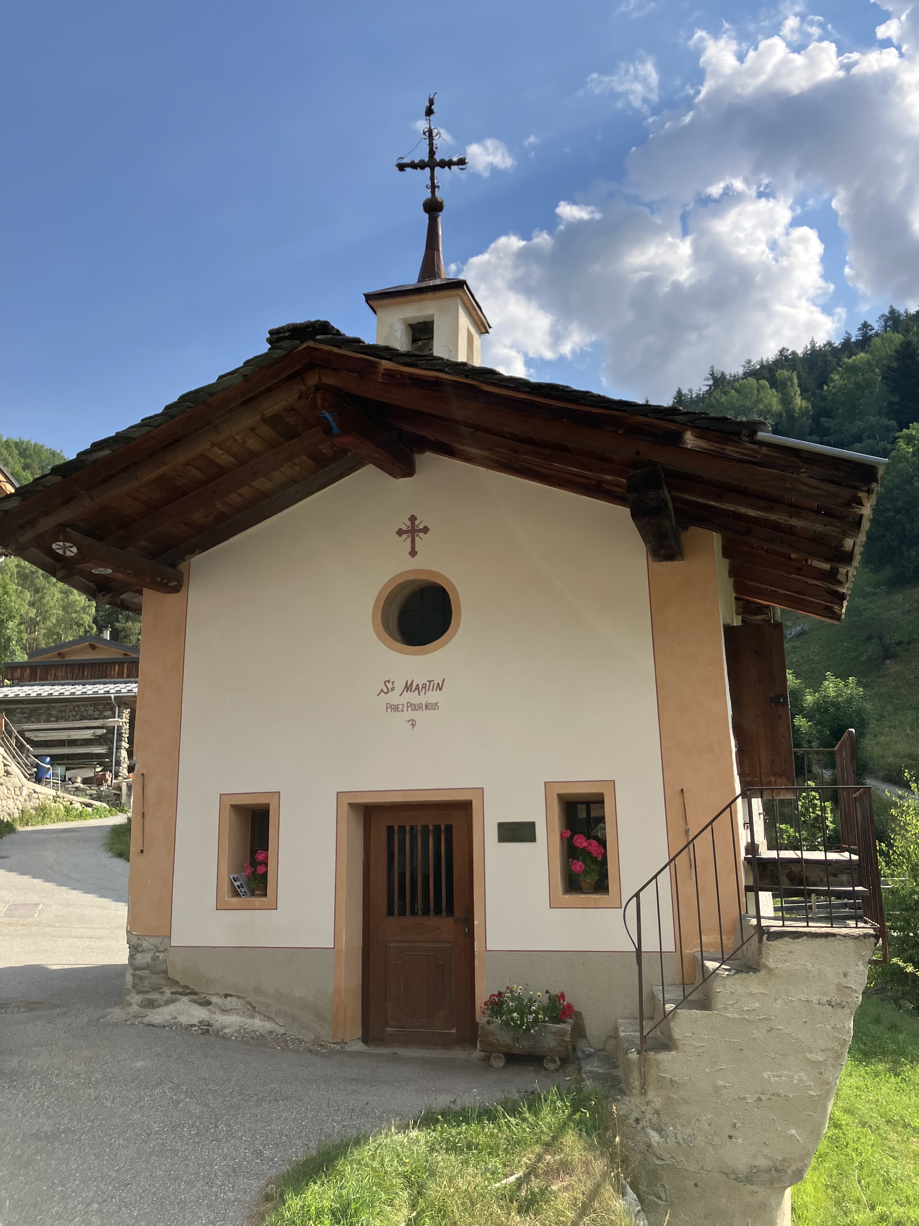 Le bâtiment : Il est en 1633 en reconstruction, en 1845 également. Il est rénové de 1862 à 1880, et en 1984. On répare les enduits en 2013, les façades sont reprises en 2015 avec une nouvelle porte d’entrée . La façade principale est percée d’un oculus et deux petites fenêtres basses. Coté torrent, un escalier en pierre avec rambarde donne accès à la tribune.