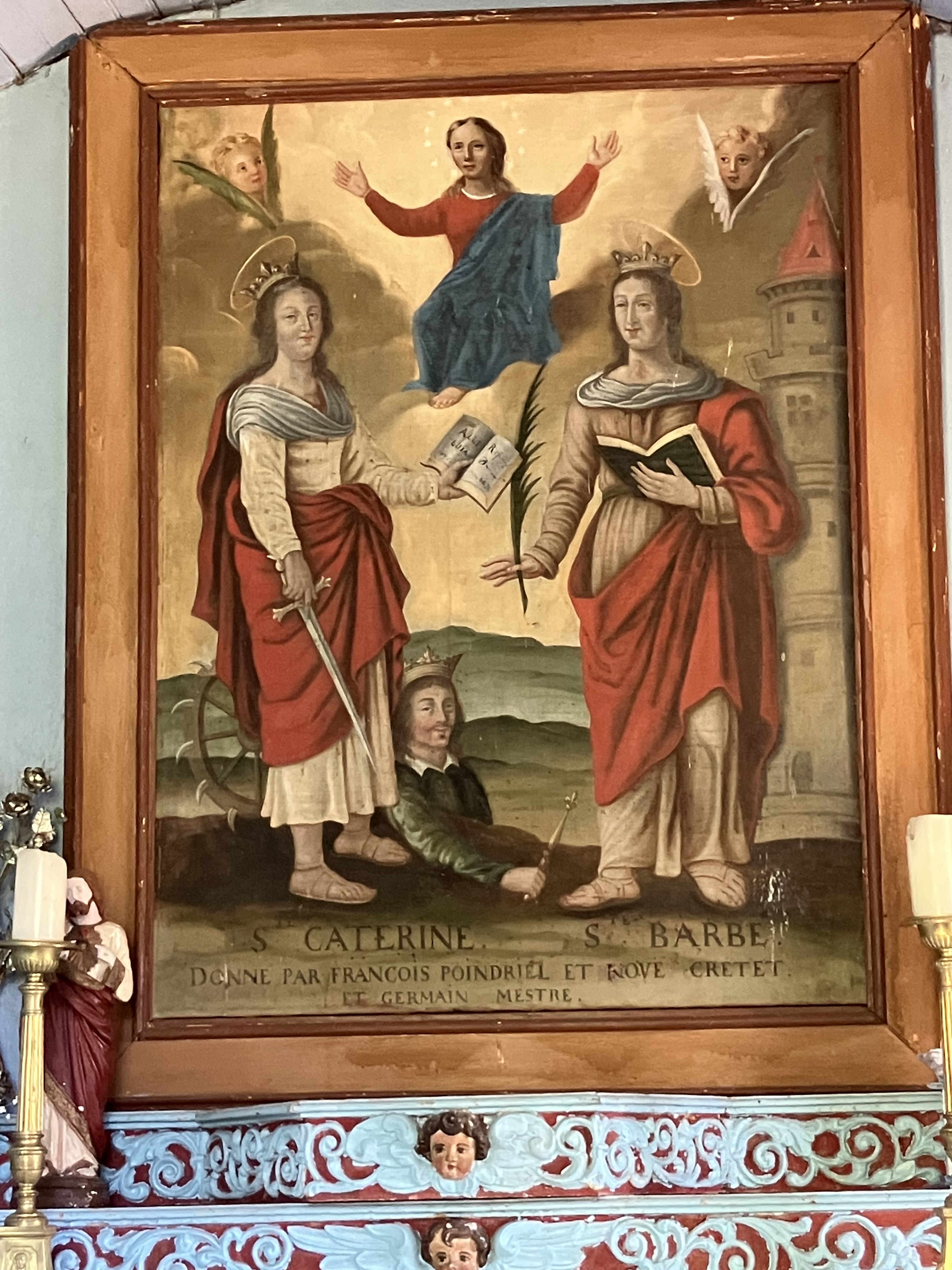 L’intérieur : Une nef unique avec voute en berceau lambrissée offre un espace restreint. Au centre du devant d’autel est peinte une tour. Au dessus de l’autel, l’unique toile, peinte en 1878, représente en haut la Vierge Marie entourée de deux anges, en bas à droite Ste Barbe (avec son attribut la Tour) et à gauche Ste Catherine d’ Alexandrie (avec son attribut l’ épée et la roue dentée) ; toile offerte par F. Pondriel, M. Crettet (inscription sur la toile) et Maitre G. qui sont les fondateurs de la chapelle par tradition. Ste Barbe et Ste Catherine sont représentées de façons identiques : même coiffure, même vêtement, même position, même chaussure. L’une tient le sabre et l’autre un végétal.