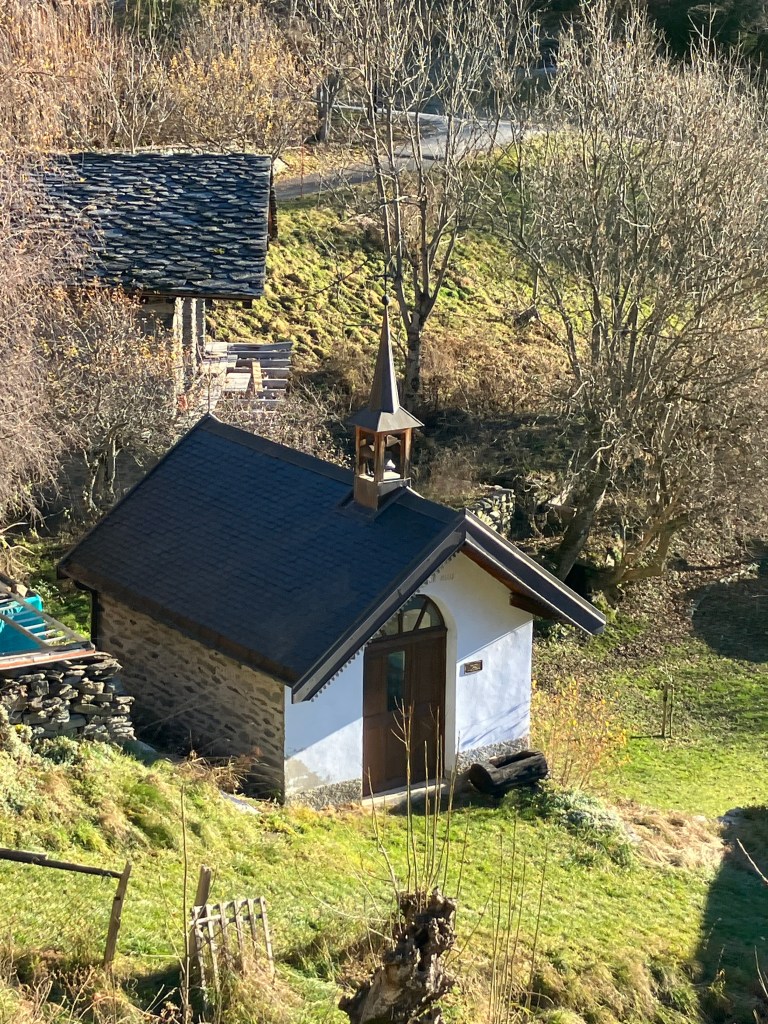 Le bâtiment : Une chapelle existait, un peu plus haut, dans le village, en 1633. Le terrain étant humide et non stable, elle est reconstruite en 1873 à l’emplacement actuel. Déjà restaurée plusieurs fois, elle demeure fragilisée par la nature du sol sur lequel reposent ses fondations. L’édifice actuel est petit, recouvert de zinc, ouvert à l’Ouest d’une large porte, et au sud d’une grande baie. En 1995 réfection du plancher, en 2012 reprise du clocher, en 2014 toiture refaite et couverte de lauzes.