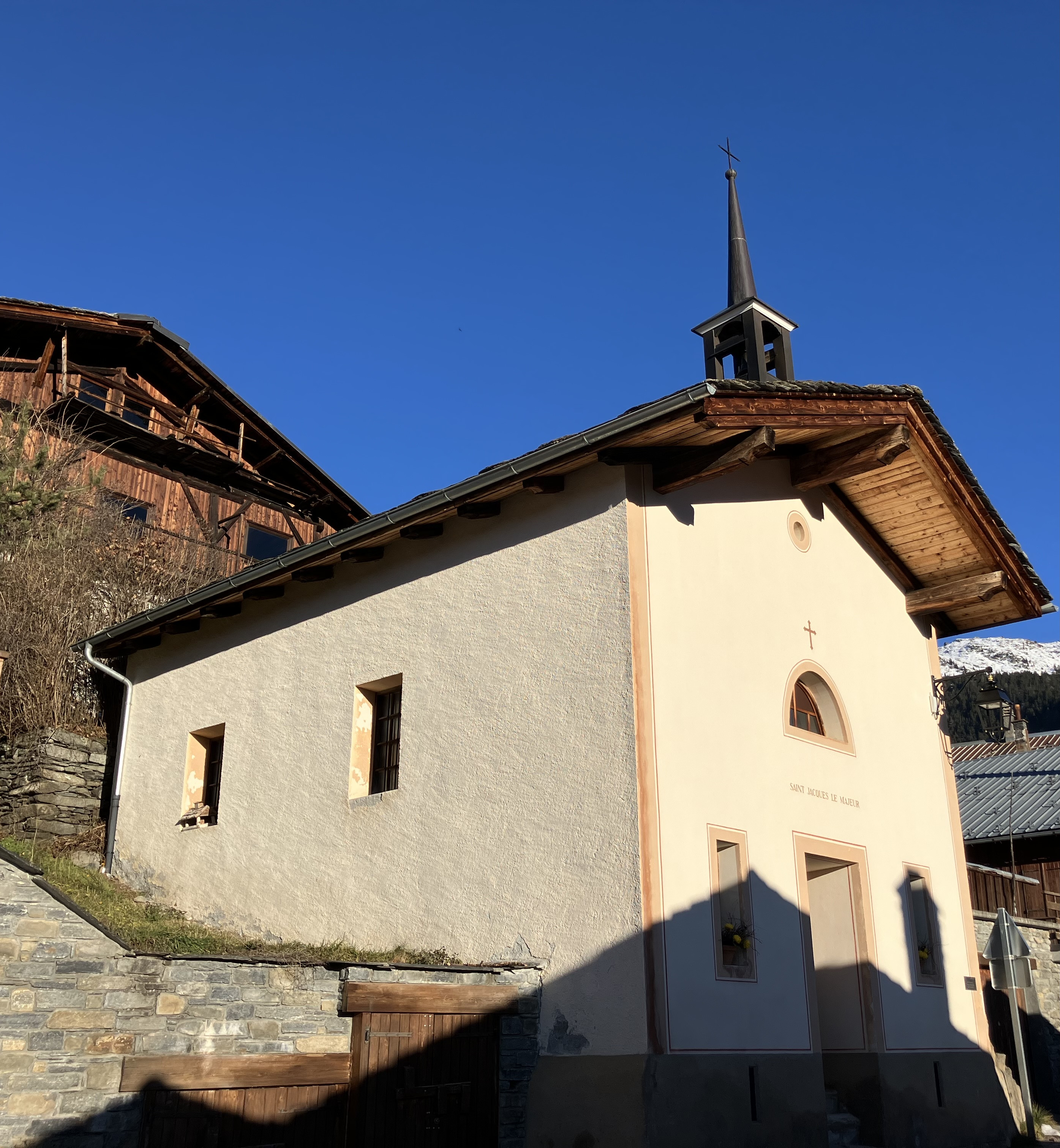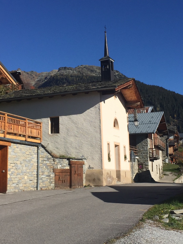 – Juste au-dessus de la chapelle, une rare maison à colonne engagée est à remarquer. Sur la haute vallée de l’Isère, surtout à Sainte Foy et Val d’Isère, ce type d’agencement est fréquent : il permet de former devant la façade principale des espaces ouverts et couverts, pour stocker bois et autres denrées ou pour travailler à l’abri des intempéries.