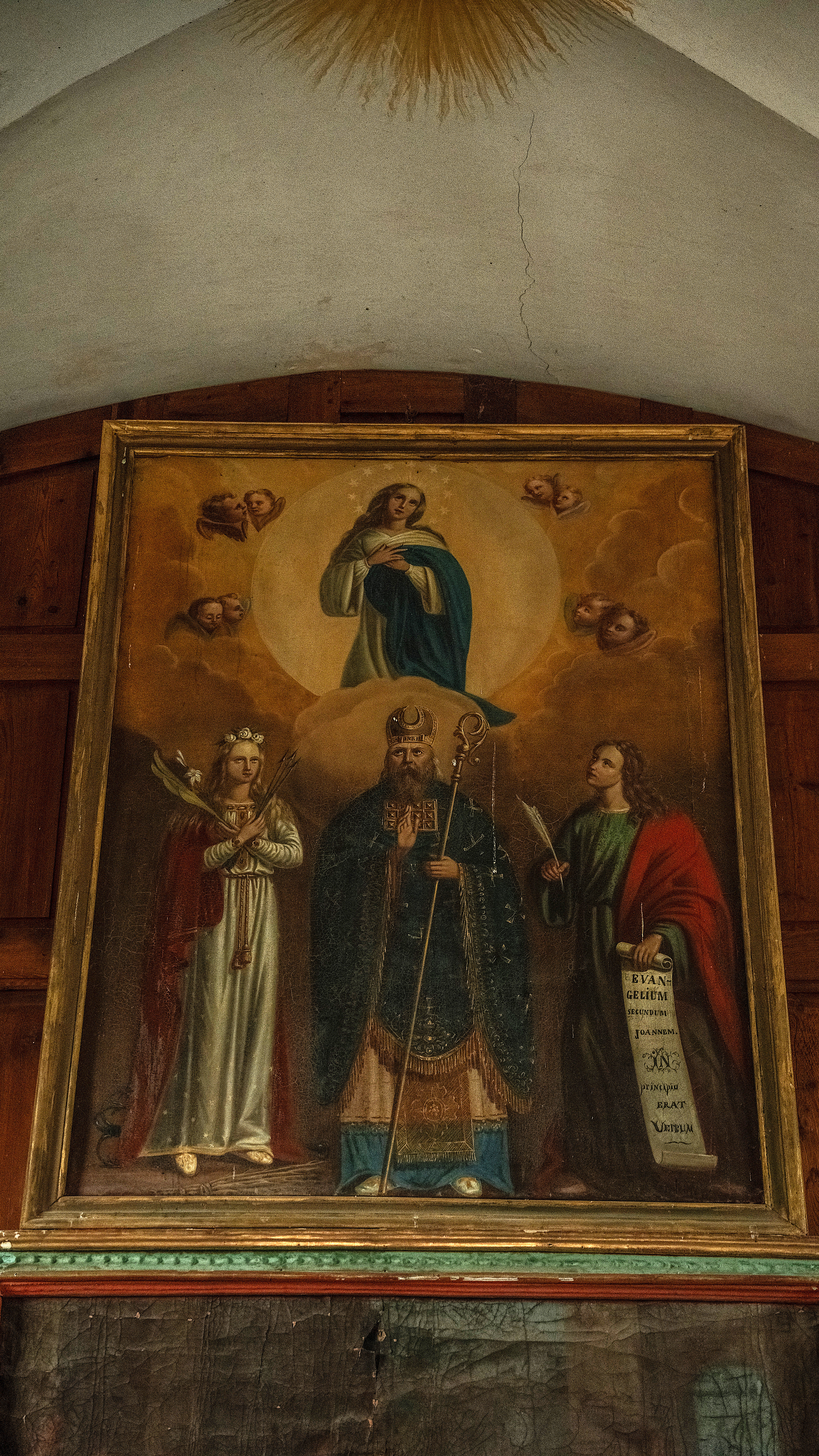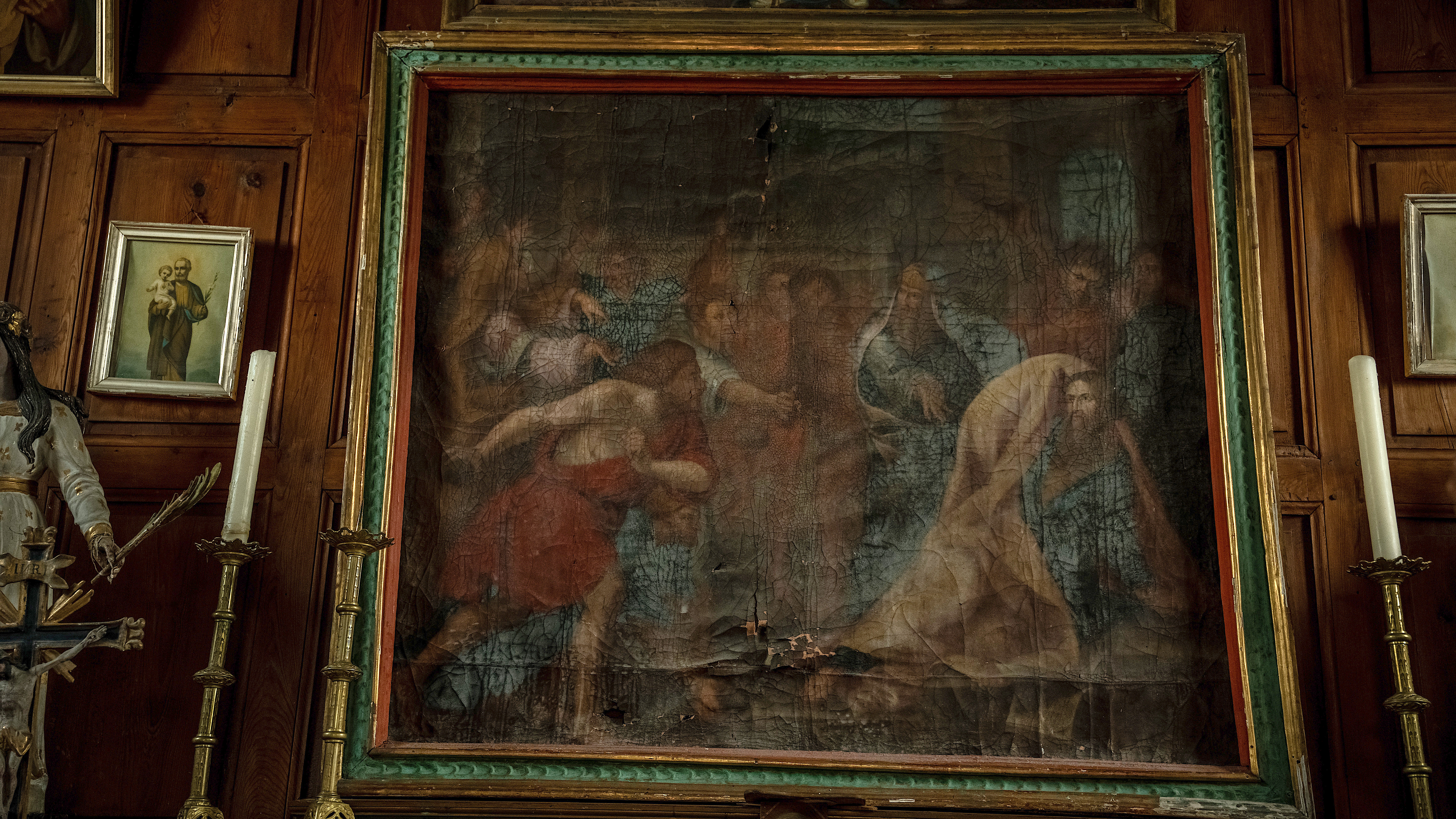 L’intérieur Au chœur deux toiles superposées au-dessus de l’Autel : en bas la représentation de la lapidation de St Jaques, puis en haut un tableau représentant La Vierge avec Ste Philomène, St Jean l’évangéliste et Hérode.