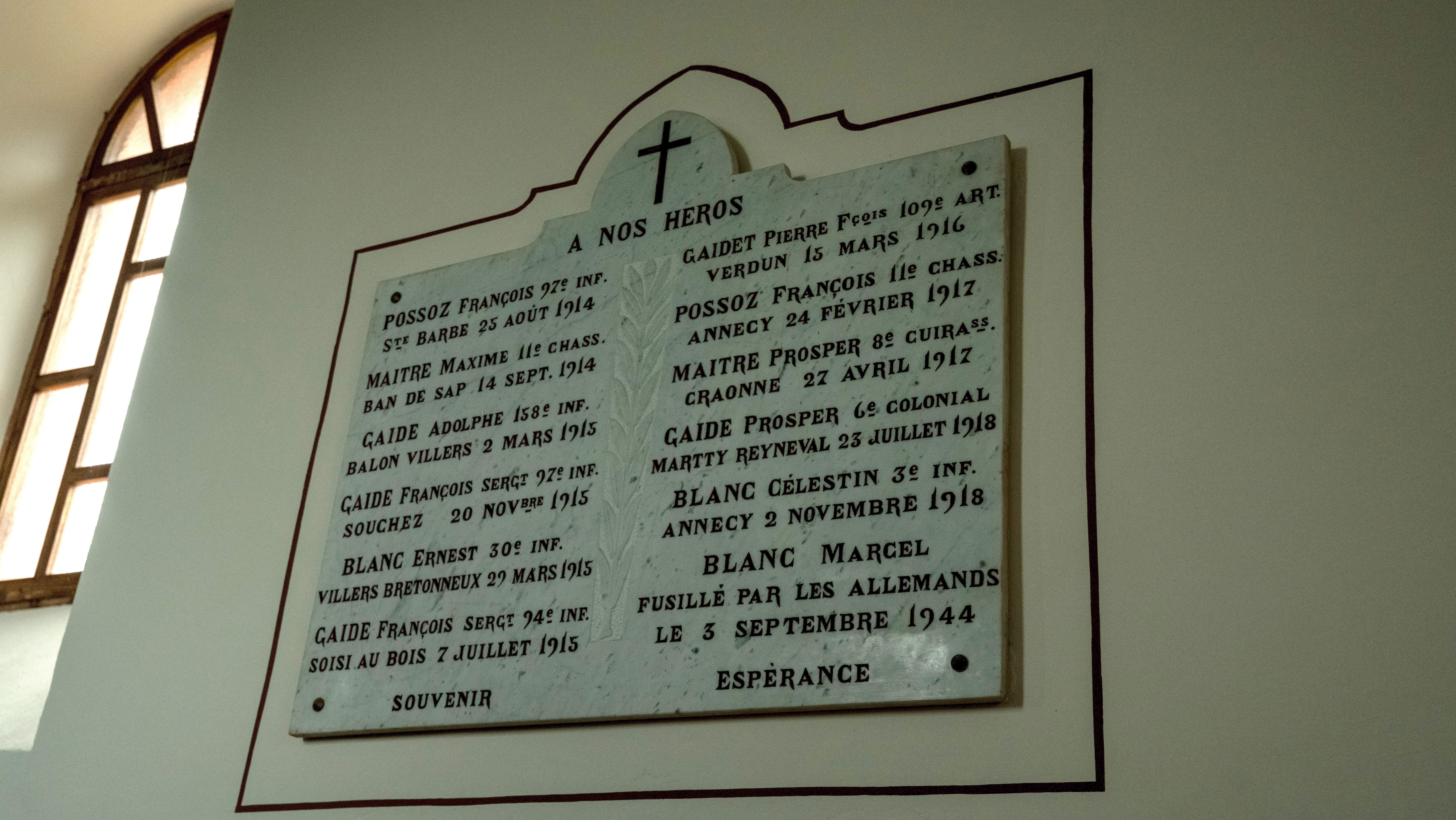 — La stèle à la mémoire de trois soldats du Régiment des Tirailleurs Marocains tués en 1944 en cet endroit, par les Allemands ; dans ce conflit de la seconde guerre mondiale, les troupes italiennes puis allemandes occupent les villages de Montvalezan, territoire stratégique à proximité de la frontière. – Au milieu du village, en la maison recouverte d’un enduit rosé, jouxtée d’une tonnelle, la petite cuisine-séjour sont également jusque vers 1960 le bistrot du coin, animé de discussions et de soirées dansées au son de l’accordéon.