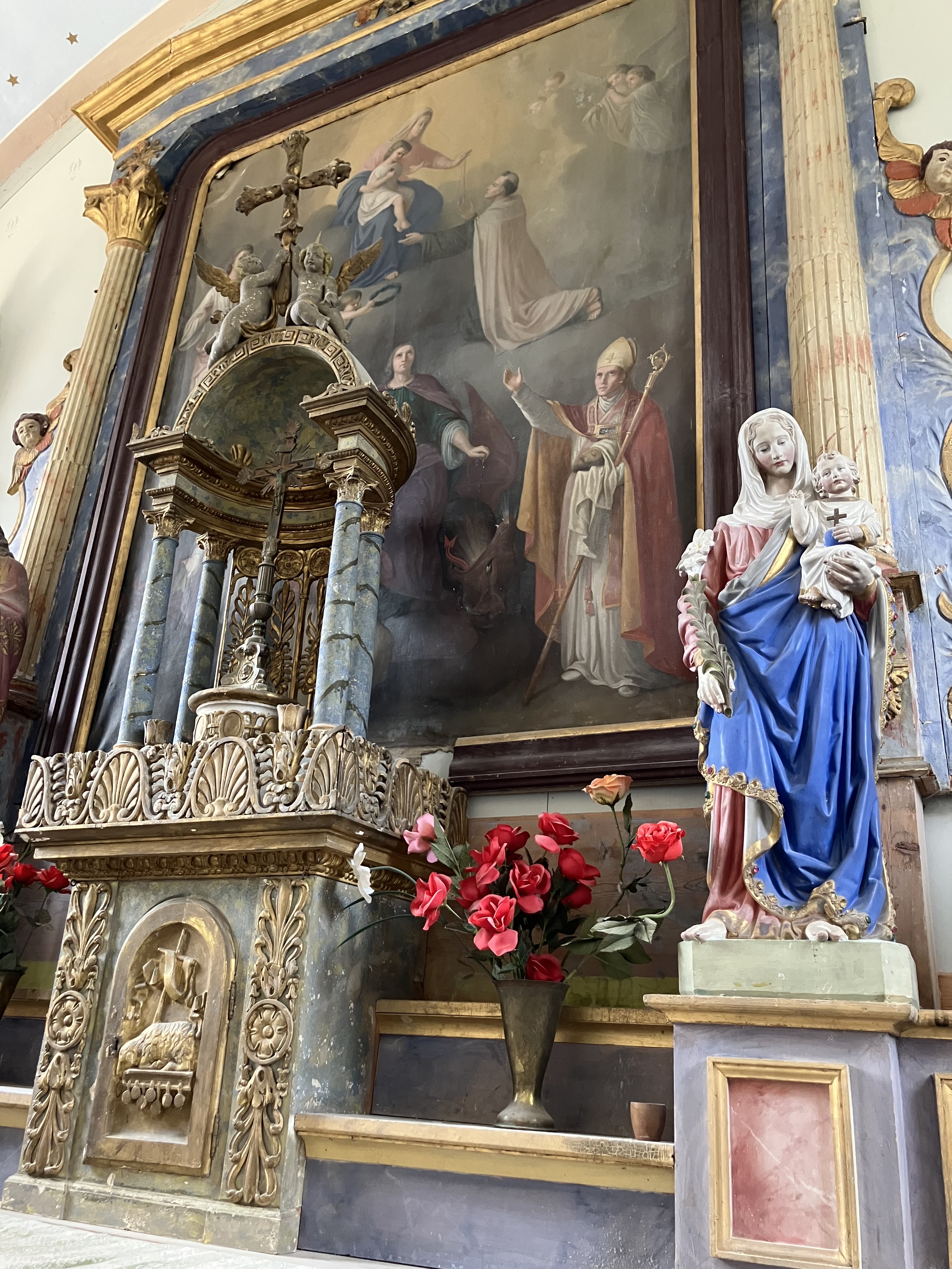 Entre deux colonnes à fût cannelé, la grande toile centrale, d’un style fin 19ème, propose en partie haute Notre Dame du Mont Carmel donnant le scapulaire à St Dominique, en partie basse St Bernard, St Grât et St Michel peseur d’ âmes accompagné d’un imposant dragon.